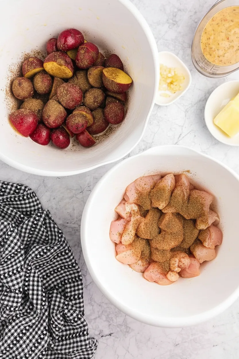 Heat your oven to 400°F (200°C) and grab a large baking sheet. Cut chicken into bite-sized pieces, trimming any visible fat. Halve the baby potatoes using a sharp knife. Place chicken in one bowl and potatoes in another.