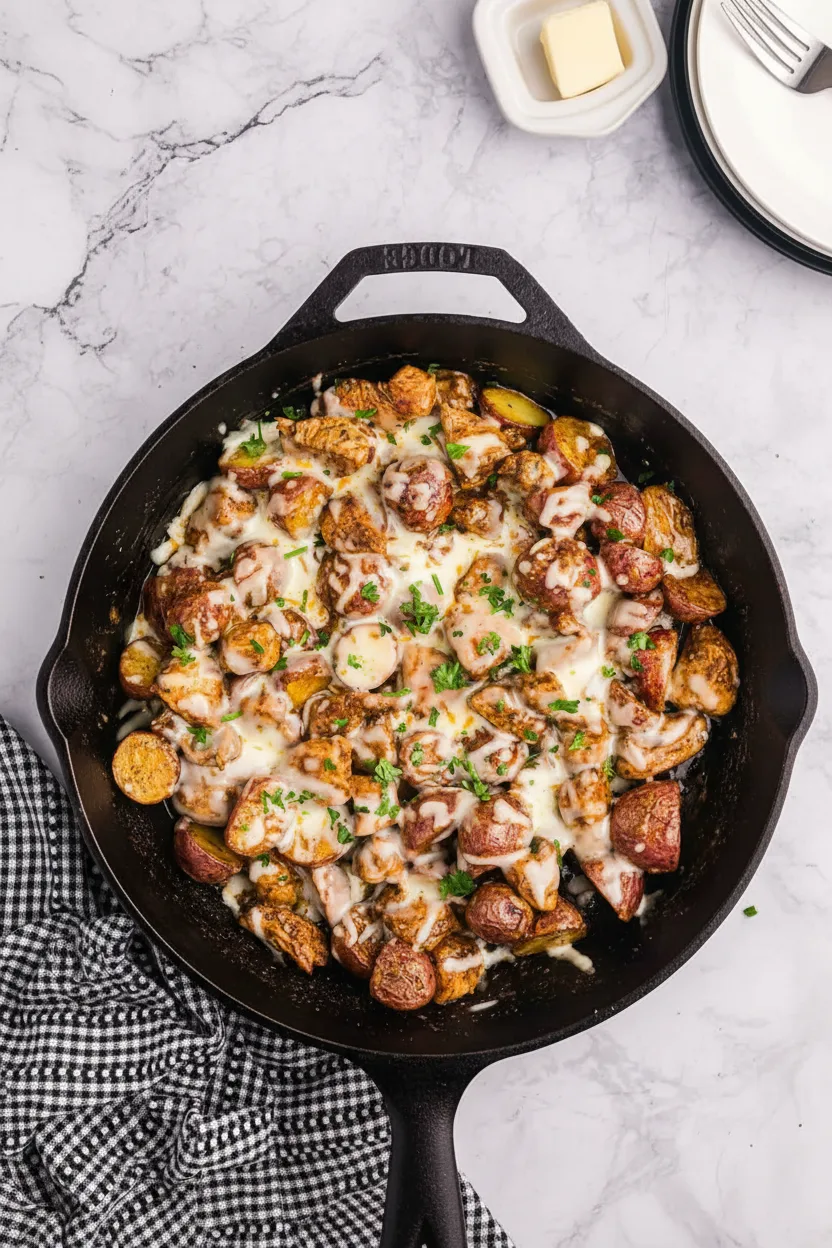 This garlic parmesan chicken and potatoes skillet delivers restaurant-quality flavor in under 35 minutes. The combination of crispy potatoes, tender chicken, and gooey cheese satisfies comfort food cravings without hours in the kitchen.