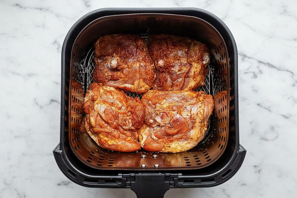 - Arrange thighs skin-side down in the air fryer basket without overcrowding.