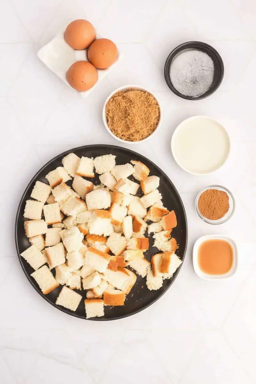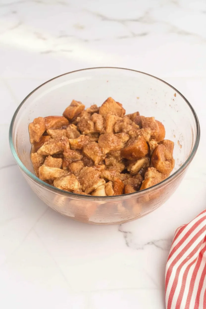 - Cut bread into bite-sized pieces, then add to the bowl with the egg mixture. Toss until evenly coated with no dry spots.