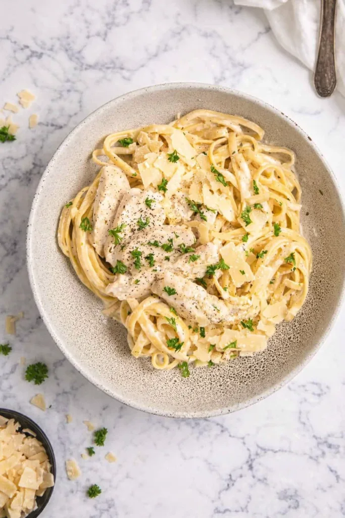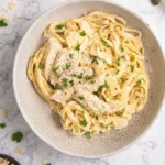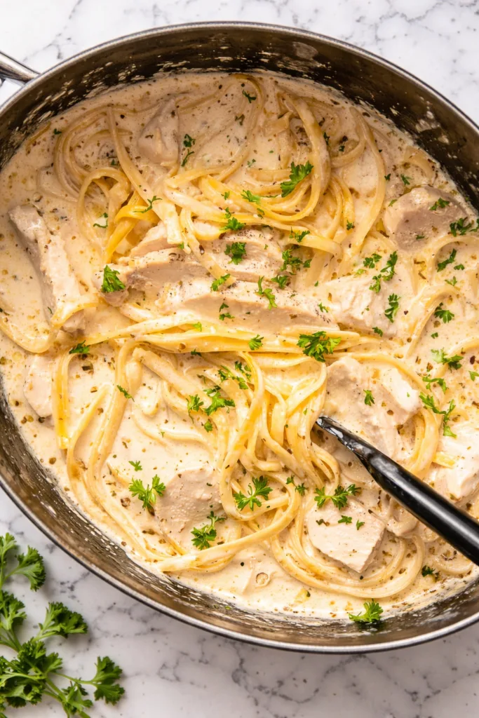 Creamy slow cooker chicken alfredo with tender chicken and fettuccine in rich garlic-Parmesan sauce.