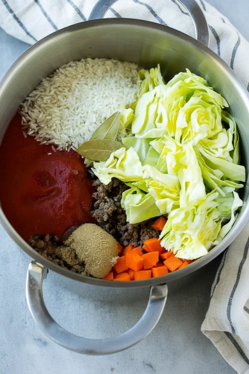 - Add the cabbage, carrots, beef broth, tomato sauce, rice, bay leaf and brown sugar to the pot. Season with salt and pepper to taste.