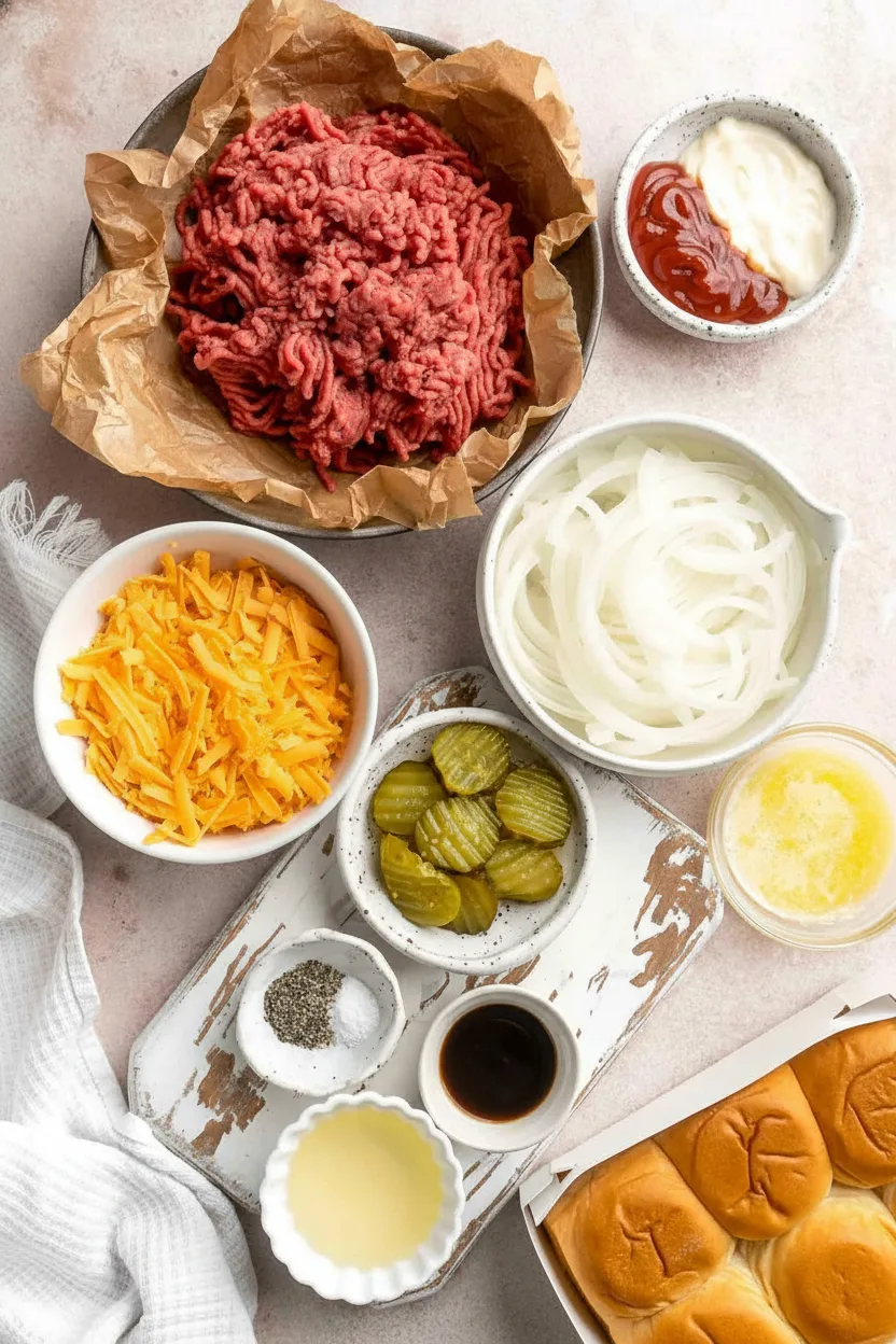 - Ground beef: 85% lean keeps sliders juicy