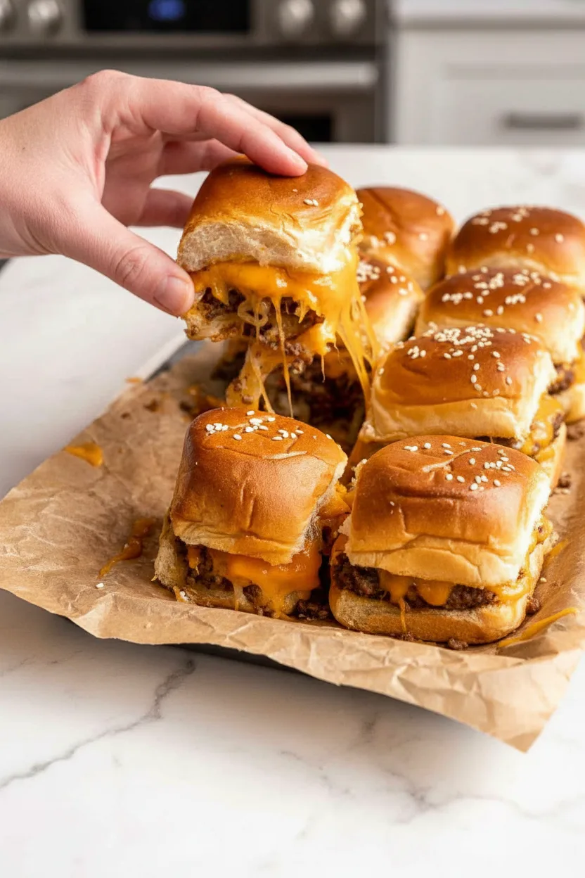 Perfect party sliders with juicy beef, melty cheddar, and soft rolls baked until golden.