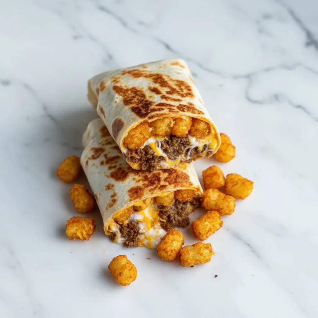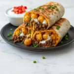 Crispy tater tots meet seasoned ground beef and melted cheese in these irresistible flour tortilla wraps – the ultimate comfort food burrito!