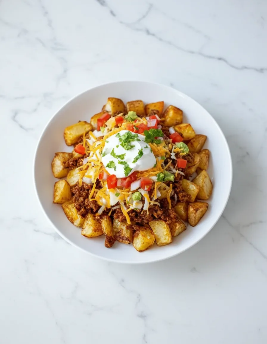 Cheesy Taco Potatoes deliver weeknight satisfaction through smart cooking techniques. The combination of crispy potatoes perfectly seasoned, meaty taco filling, and creamy melted cheese never fails to please family appetites. Both kids and adults love customizing their bowls with favorite toppings. Clean-up stays minimal since cooking requires just one skillet and an air fryer basket. For another 30-minute wonder meal, try adding this recipe to your regular rotation alongside other quick skillet dinners.