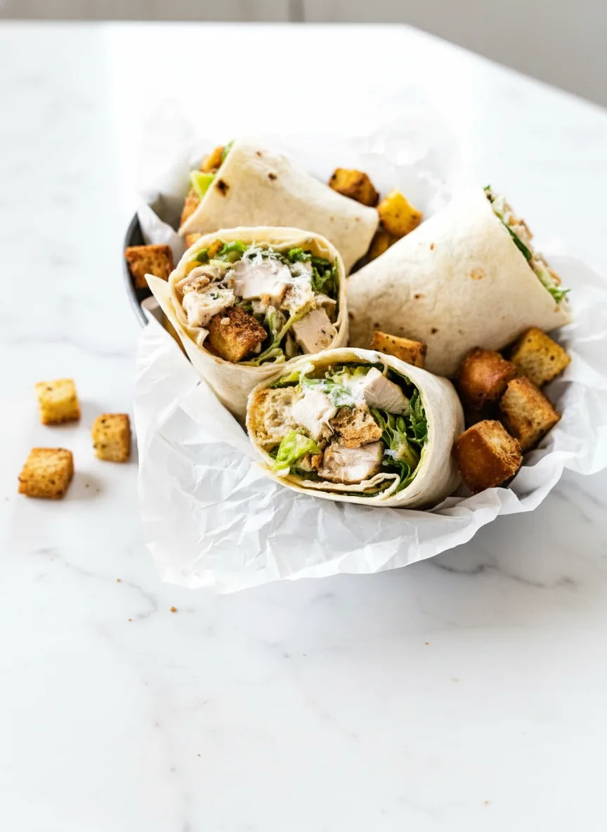 Quick and flavorful chicken Caesar wraps with crisp romaine, tender chicken, and creamy dressing in soft tortillas.