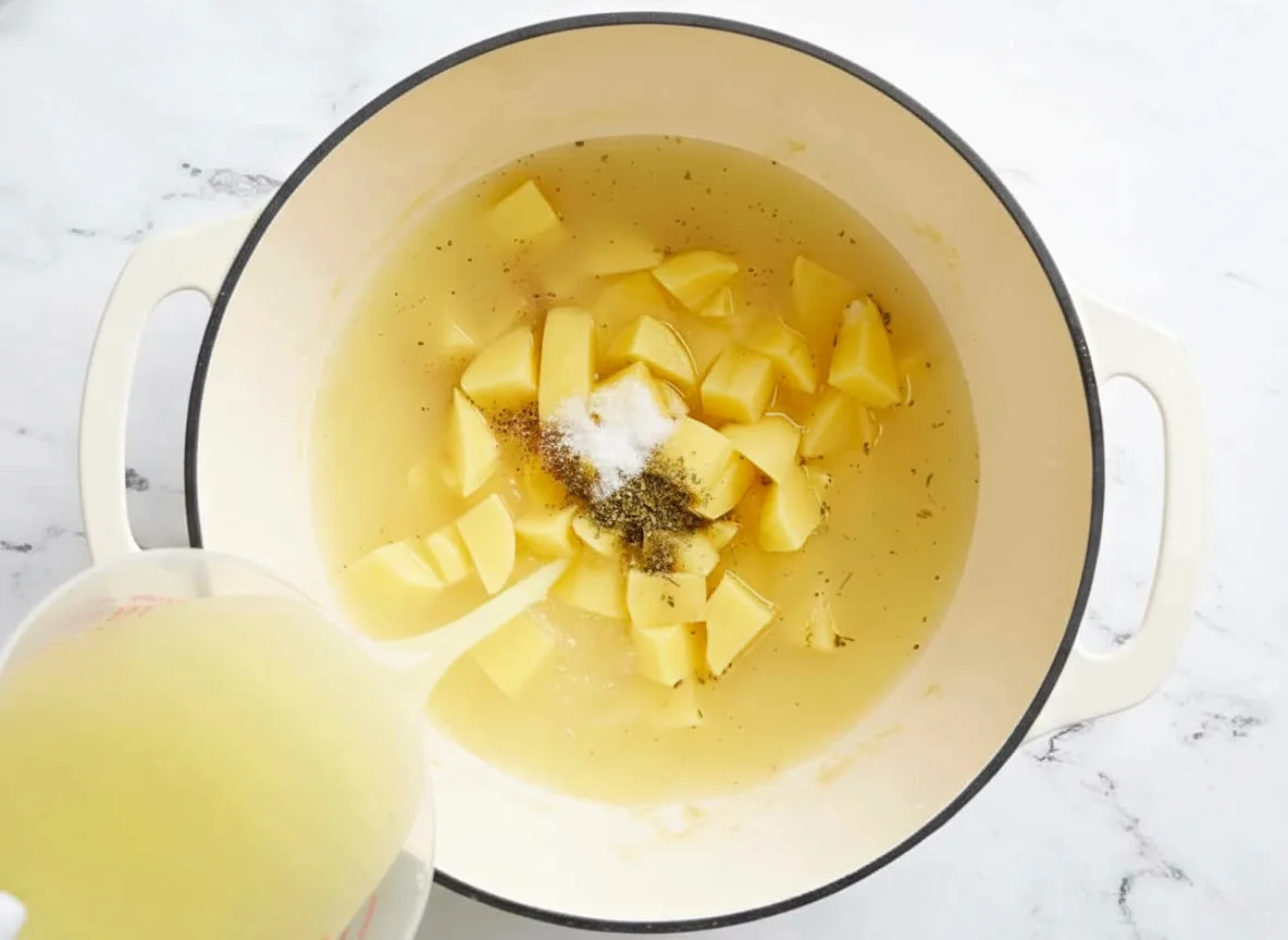 - Add Italian seasoning, salt, pepper, potatoes, and chicken broth. Stir well.