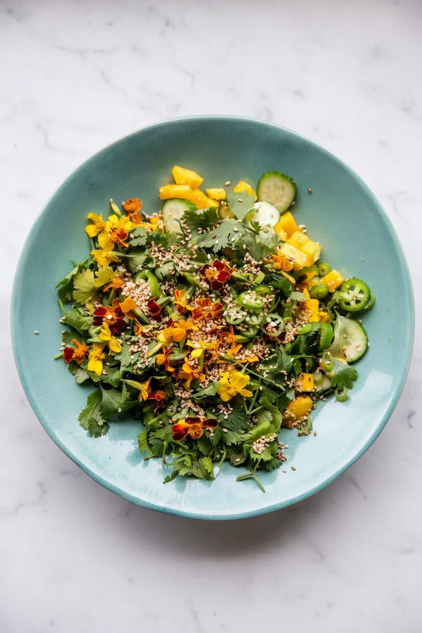 - To make the salad: Combine the mango, cucumbers, serrano pepper, cilantro, basil, and green onions in a bowl. Toss with olive oil, vinegar, and lime juice, and season with salt. Add the avocado and toss lightly. Sprinkle the sesame and/or sunflower seeds overtop.