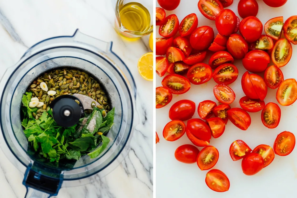 The pesto is the star. You need half a cup of pepitas, which are hulled pumpkin seeds. They toast to a wonderful nuttiness. You also need half a cup each of packed fresh basil and fresh flat-leaf parsley. The parsley adds a clean, fresh layer. For acidity, use a quarter cup of fresh lemon juice. One chopped garlic clove and half a teaspoon of fine salt build the base flavor. Finally, one-third cup of extra-virgin olive oil brings everything together into a smooth, emulsified sauce.