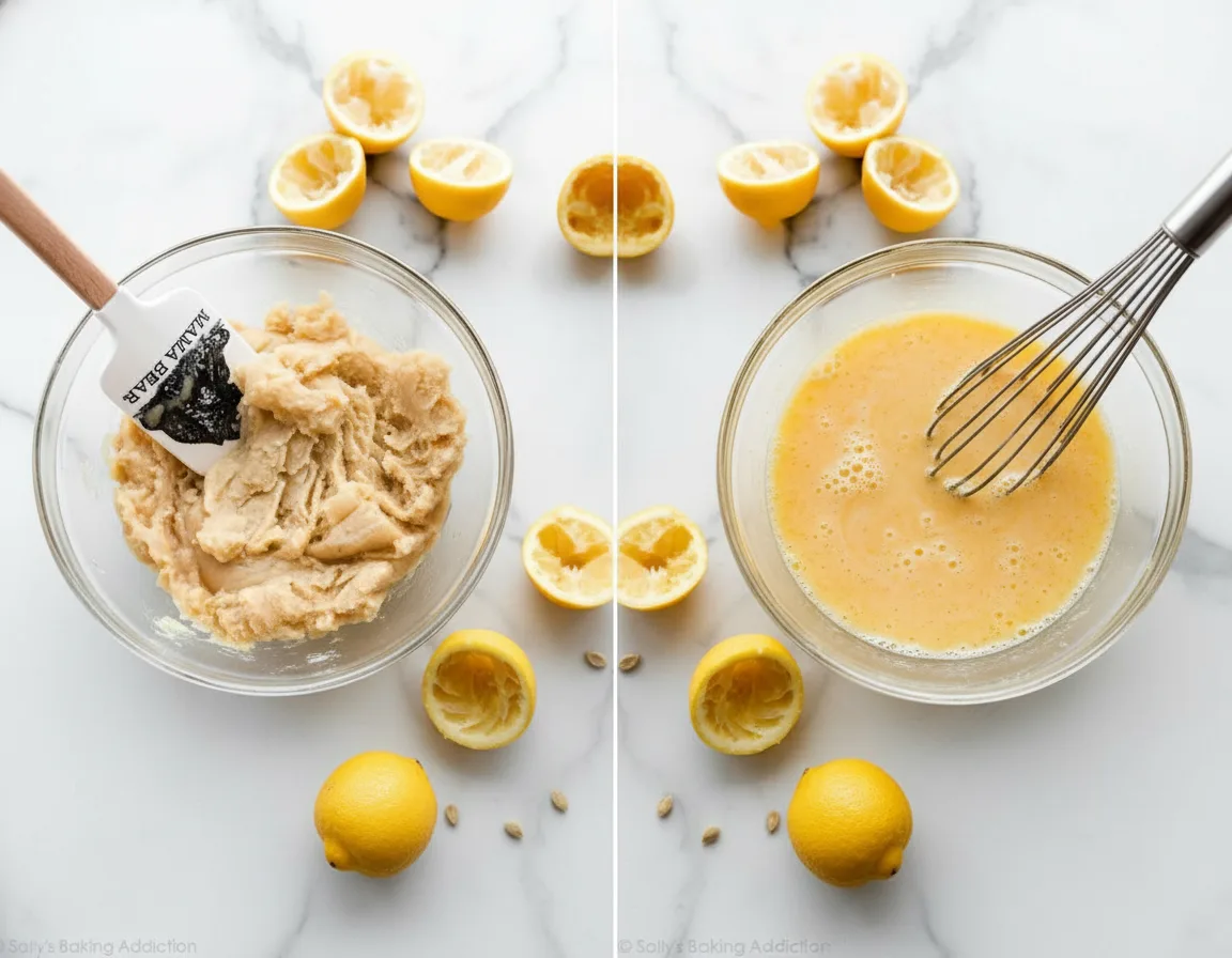 - Sift the sugar and flour together in a large bowl. Whisk in the eggs, then the lemon juice until completely combined.