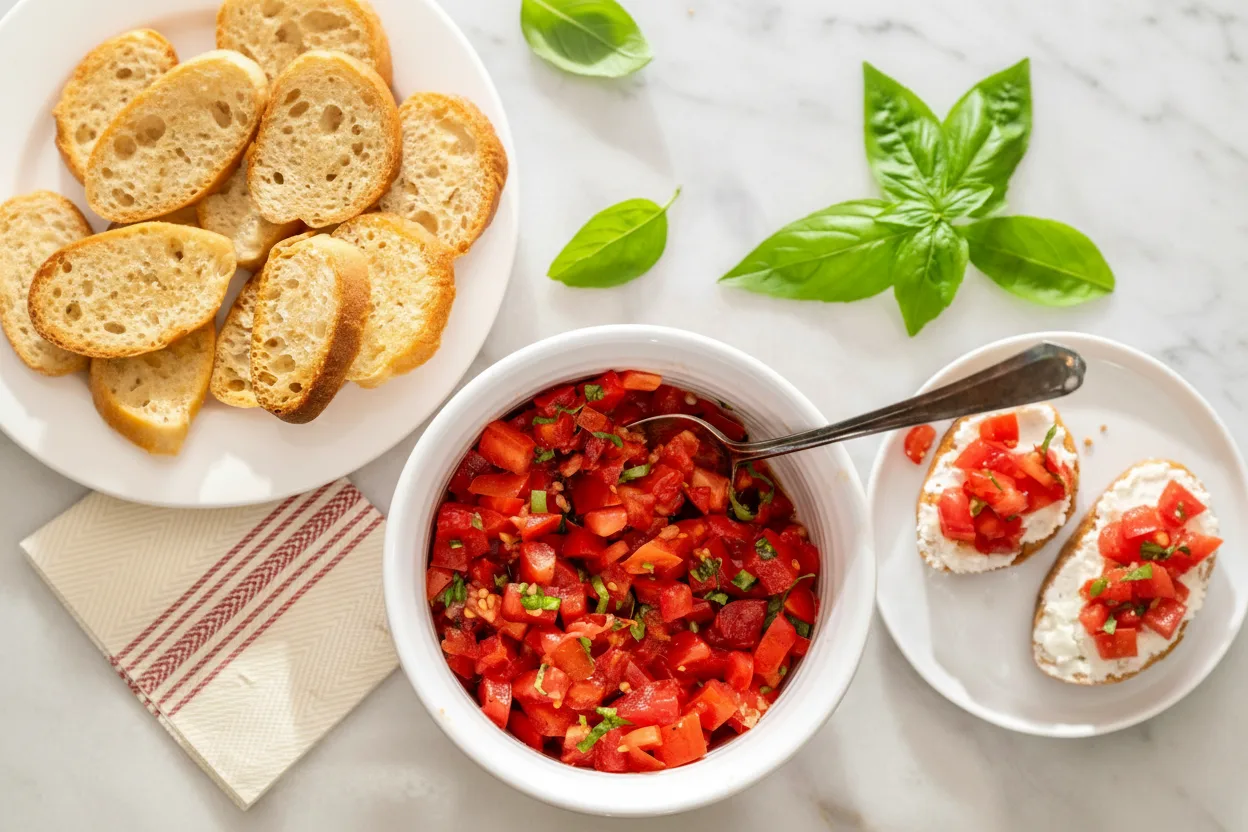 A vibrant, no-cook dip featuring fresh tomatoes, basil, and garlic, perfect for scooping with crispy crostini.
