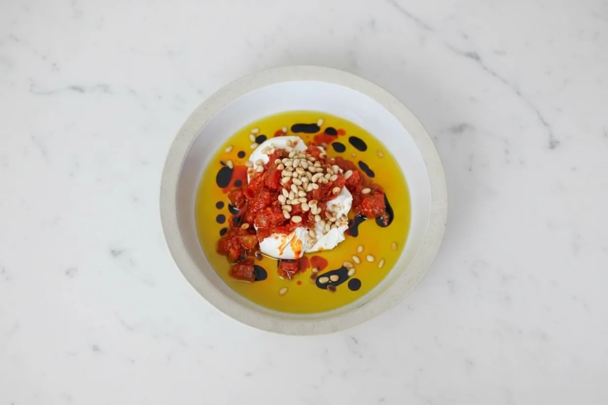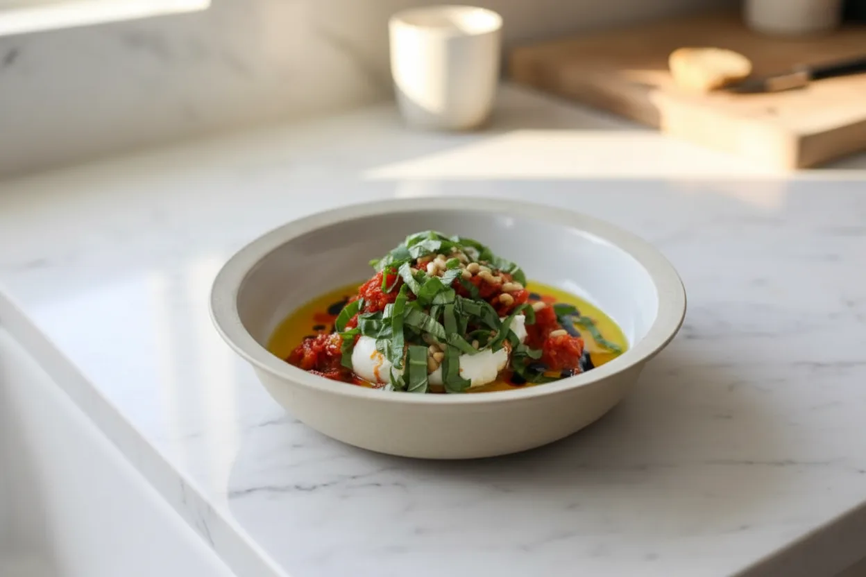 A luxurious and easy 15-minute dip featuring creamy burrata cheese, zesty tomato bruschetta, and a kick of chili oil. Perfect for entertaining!
