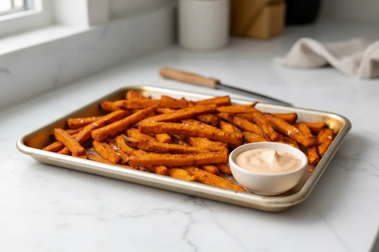 Toss sweet potato sticks with oil first. Then add salt and spices. Mix thoroughly with clean hands. Every piece should glisten with oil. This coating helps spices stick and promotes even browning. Don’t skip massaging the spices into every crevice.