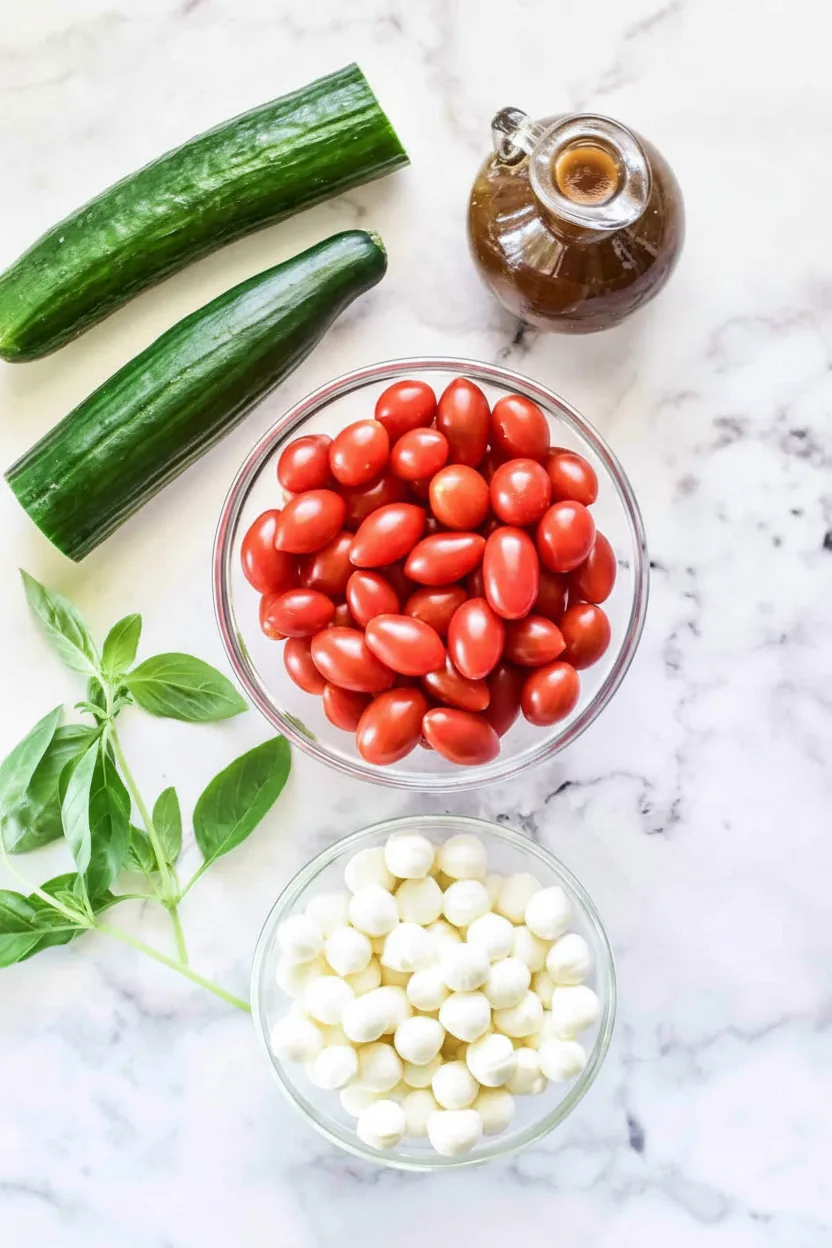 A refreshing and easy salad with crisp cucumber, creamy mozzarella pearls, sweet tomatoes, and fresh basil tossed in a tangy balsamic vinaigrette.