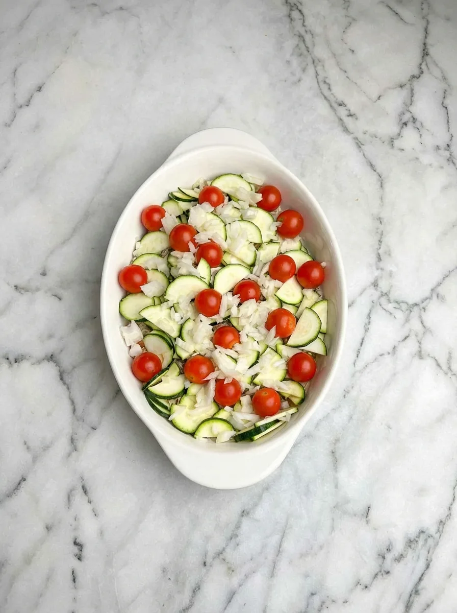 Spread uncooked basmati rice evenly in your baking dish. Top it with diced chicken, grated zucchini, yellow onion, whole grape tomatoes, and lemon wedges. Sprinkle your spice mixture over everything before pouring chicken stock across all layers.