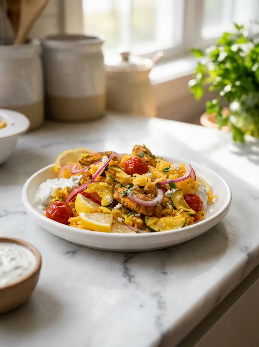 A flavorful Greek-inspired casserole with chicken, rice, vegetables, and creamy tzatziki sauce.