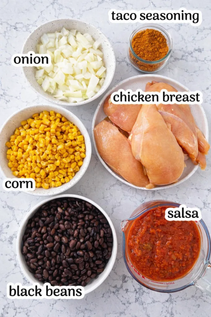 Drain and rinse beans thoroughly before scattering them over chicken with corn and onions. Finally, spread remaining salsa as the top layer.