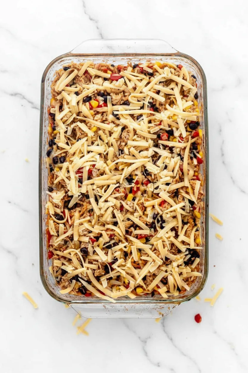 - Add shredded chicken, black beans, and corn to the baking dish. Stir until well combined.