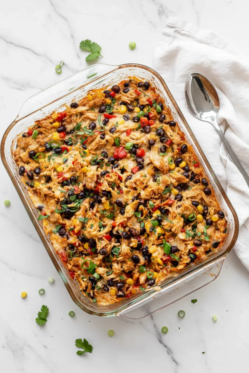 A hearty baked casserole with shredded chicken, rice, beans and vegetables in Tex-Mex flavors – all cooked in one dish!
