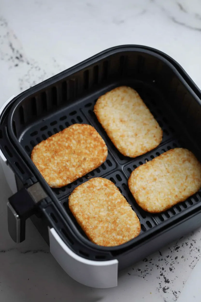 Place frozen hash brown patties in a single layer, leaving space between each piece. Never stack them since air circulation makes the magic happen. Depending on your air fryer size, you might cook 2-4 at once.