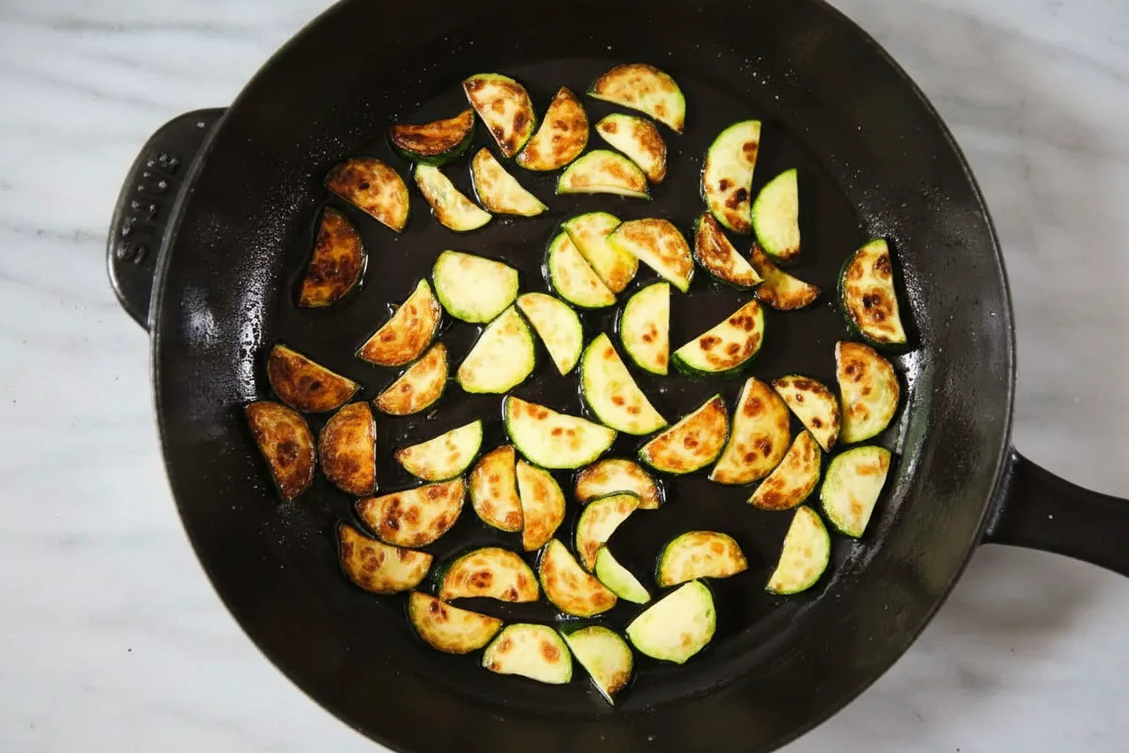 - Heat olive oil in large skillet over medium-high heat. Sauté zucchini slices until golden. Season with salt and pepper during cooking.
