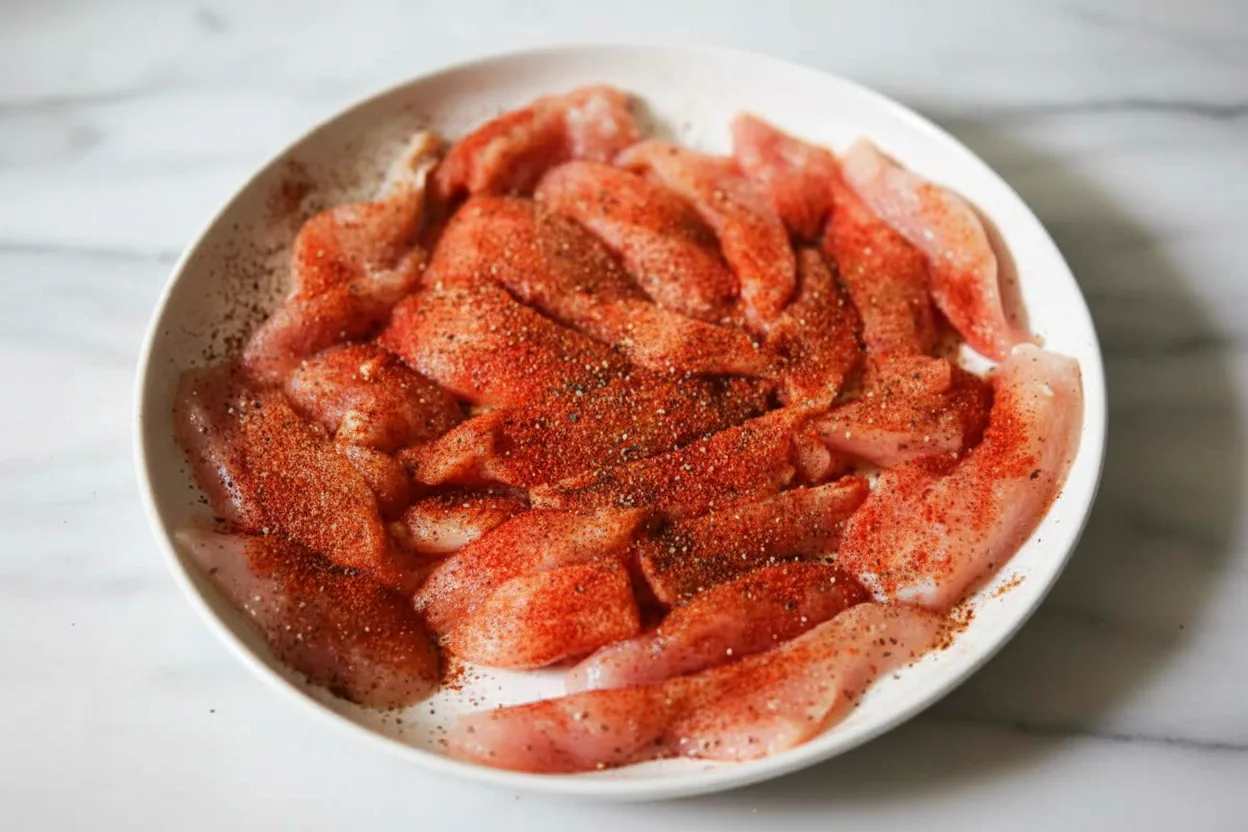 - Season chicken slices with smoked paprika, chili powder, salt, and black pepper.