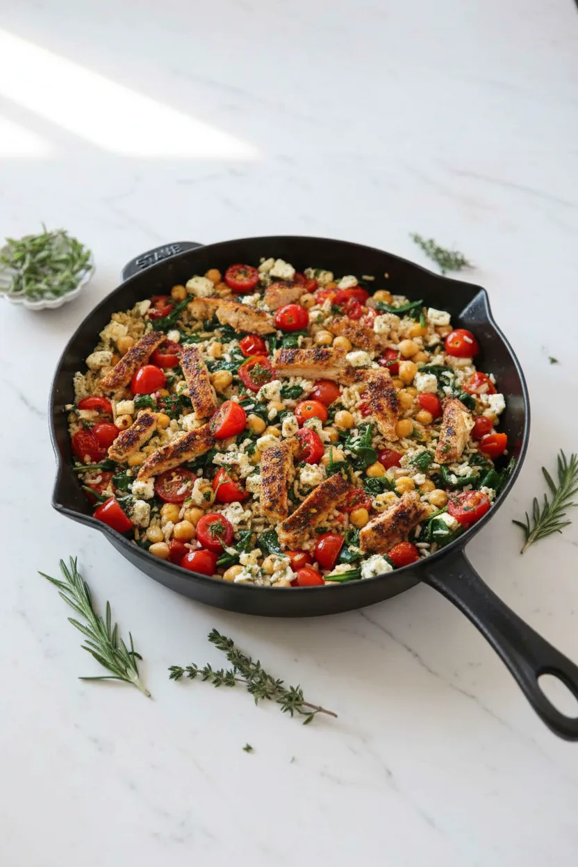A vibrant Mediterranean-inspired skillet meal with juicy chicken thighs, lemony rice, spinach, tomatoes, chickpeas, and tangy feta cheese.