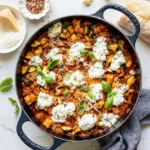 The ricotta mixture melts beautifully over the hot skillet contents. For extra visual appeal, swirl it gently into the sauce before serving.