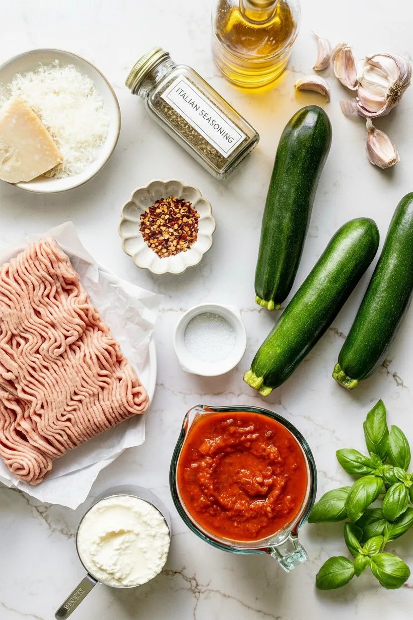 A quick and healthy ground turkey recipe with zucchini and marinara sauce, topped with creamy ricotta cheese.