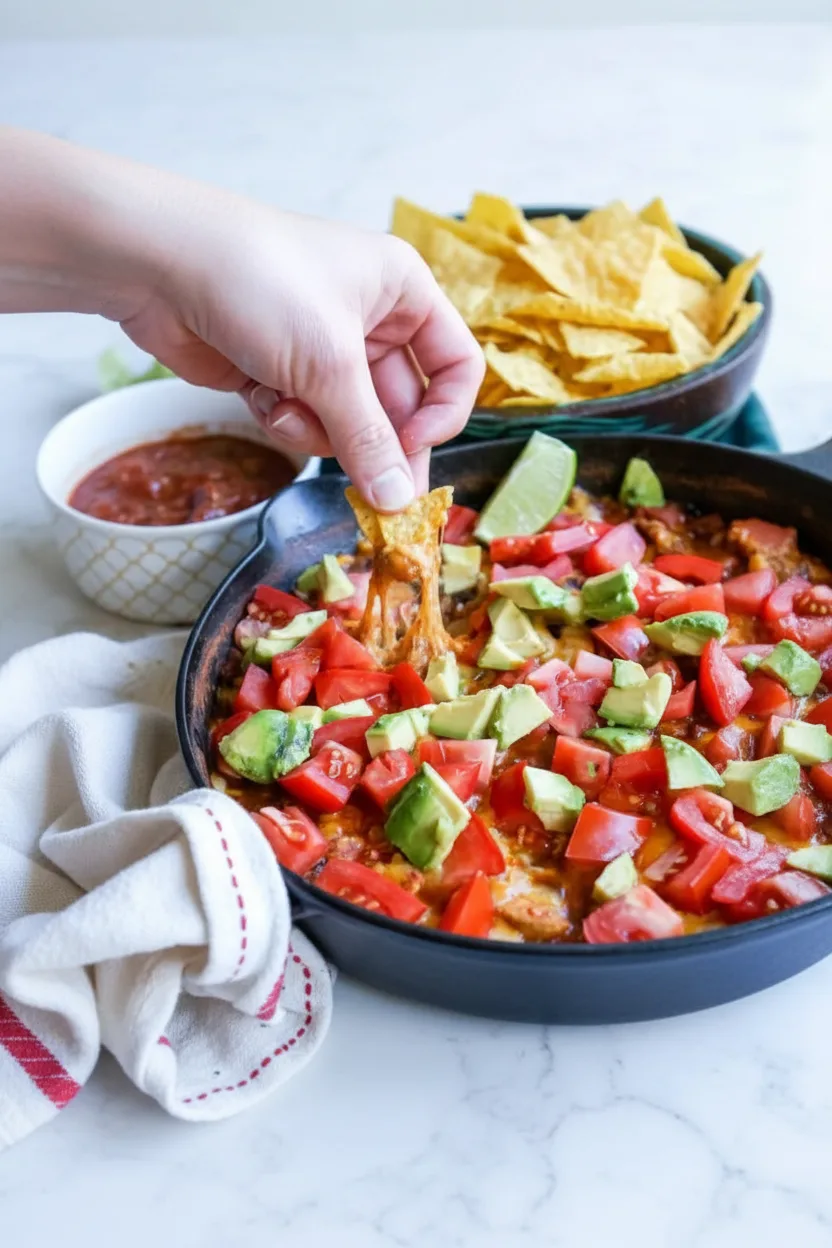 While this skillet is a complete meal by itself, several accompaniments elevate the experience. Warm tortillas or fluffy rice allow guests to assemble their own burrito bowls. Sour cream or Greek yogurt cools the spice, while fresh lime wedges brighten rich flavors. Alternatively, scoop portions into crispy taco shells or spoon over nacho chips. For comforting cheesy pairings, look at our golden chicken pillows with Parmesan sauce as inspiration for gourmet dairy combinations.