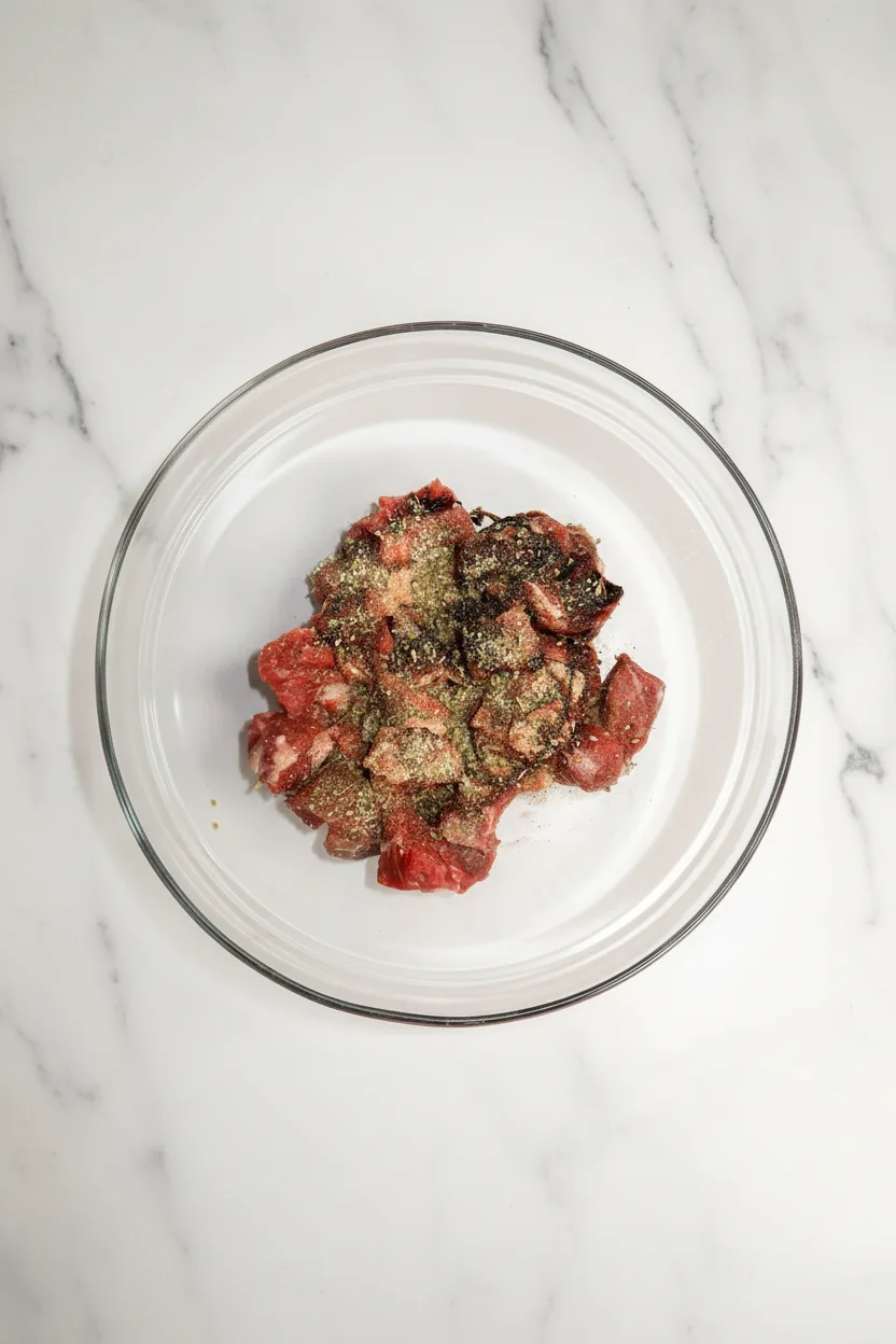 - In a large bowl, combine the cubed beef with the Worcestershire sauce and half of the spice mixture. Toss until the beef is evenly coated all over.