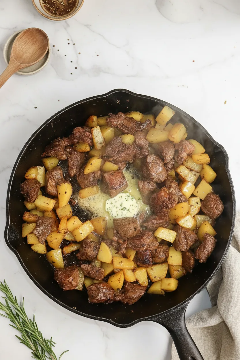 - Return the beef to the skillet with the potatoes, then stir in the garlic herb butter. Toss everything together until completely coated.