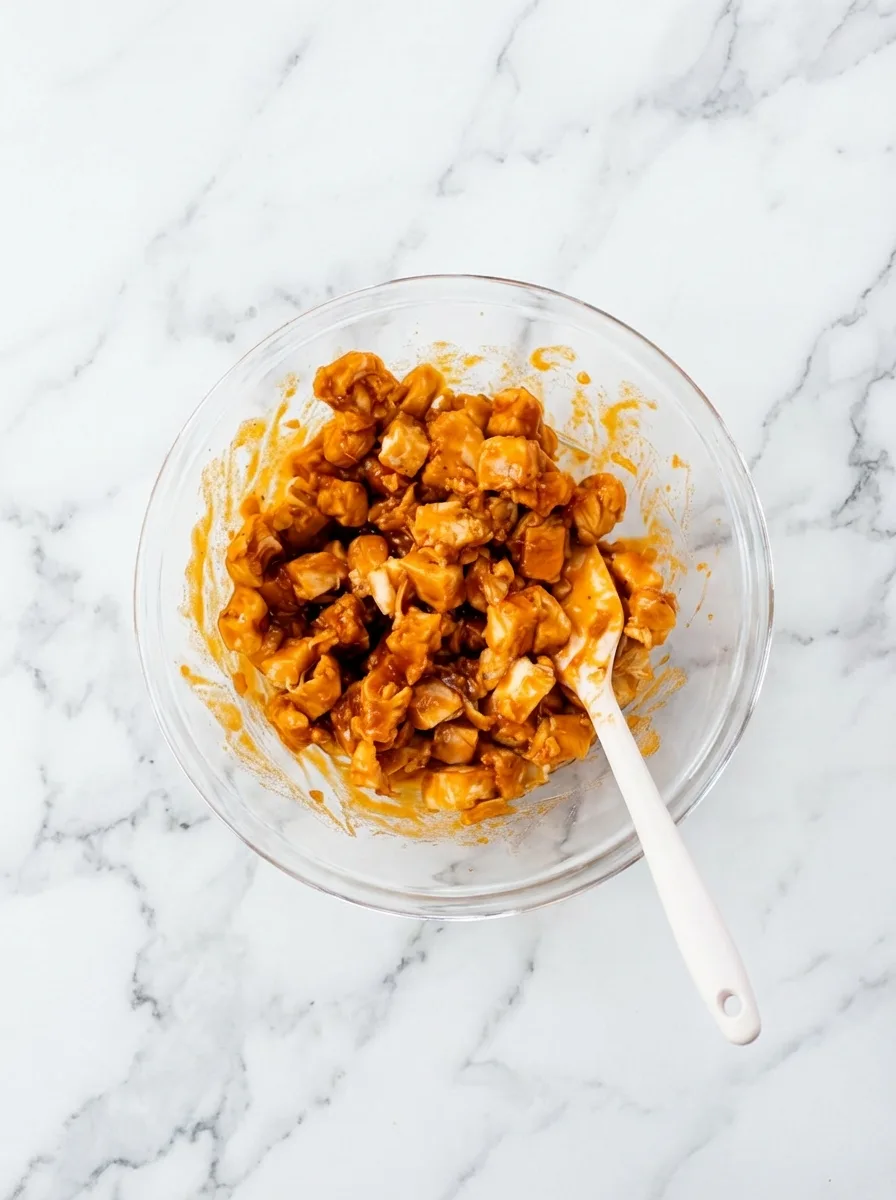 Grab a small bowl and combine diced chicken with honey garlic sauce and plain hot sauce. Stir thoroughly until every piece glistens with spicy-sweet coating. The longer it sits, the deeper the flavors penetrate – aim for at least 10 minutes while prepping vegetables.