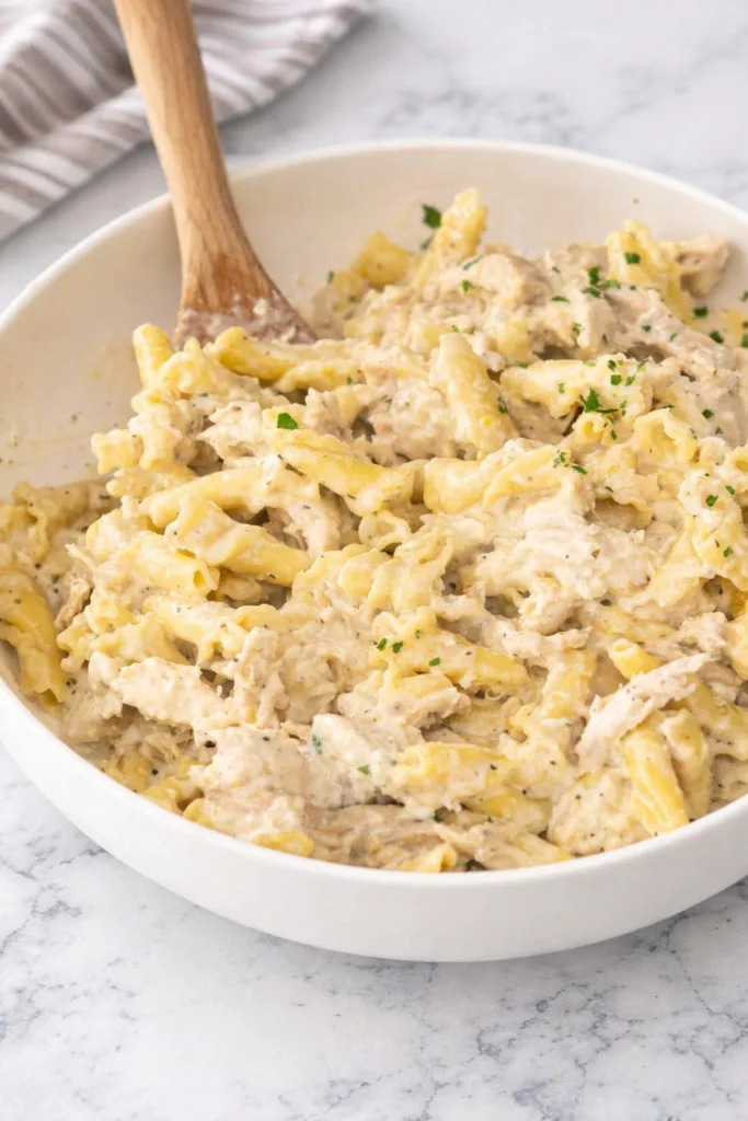 Creamy, comforting slow cooker chicken Alfredo with tender pasta and rich cheese sauce