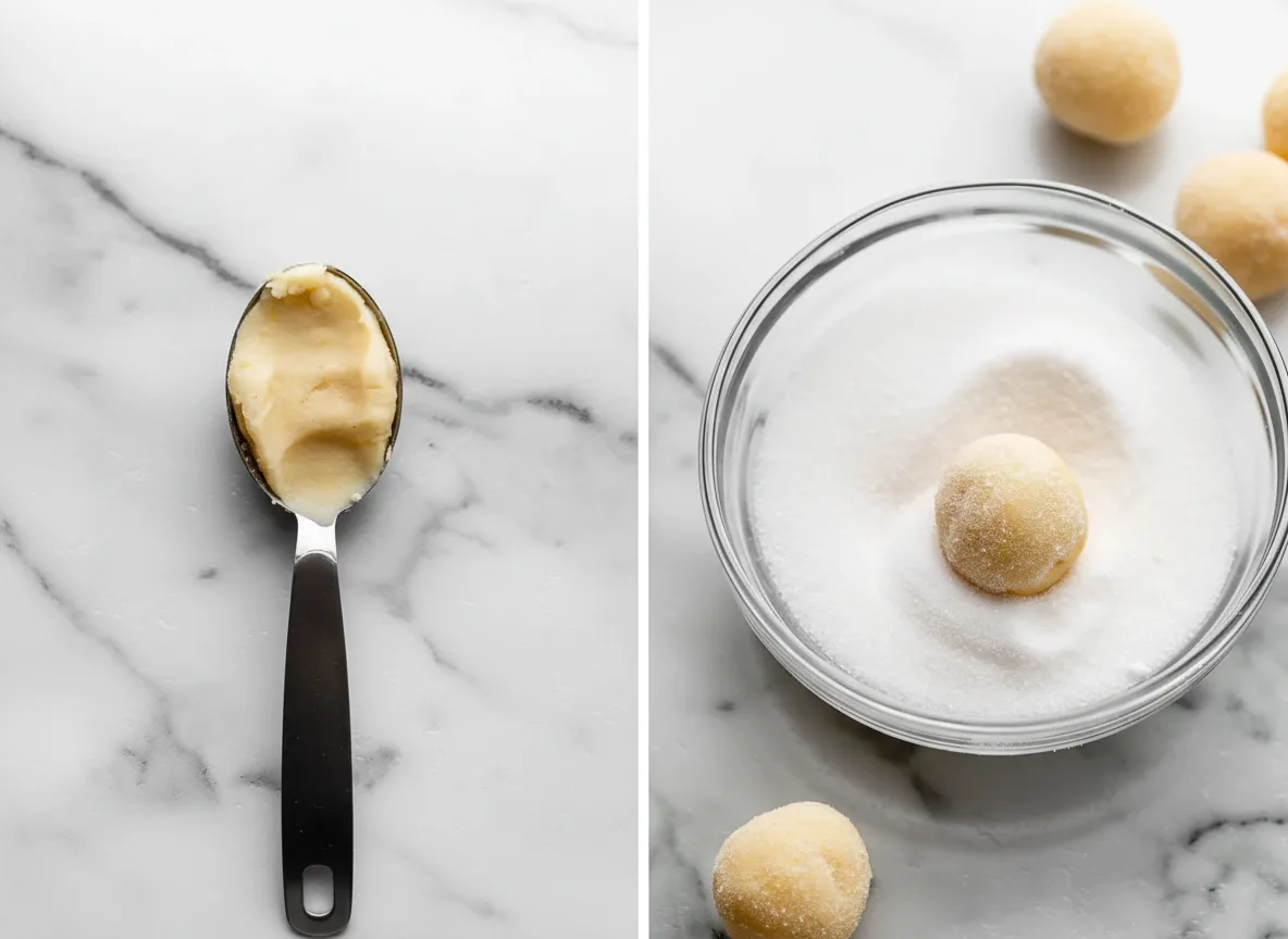 - Scoop cold dough (1 Tablespoon each), roll into balls, then roll in granulated sugar.