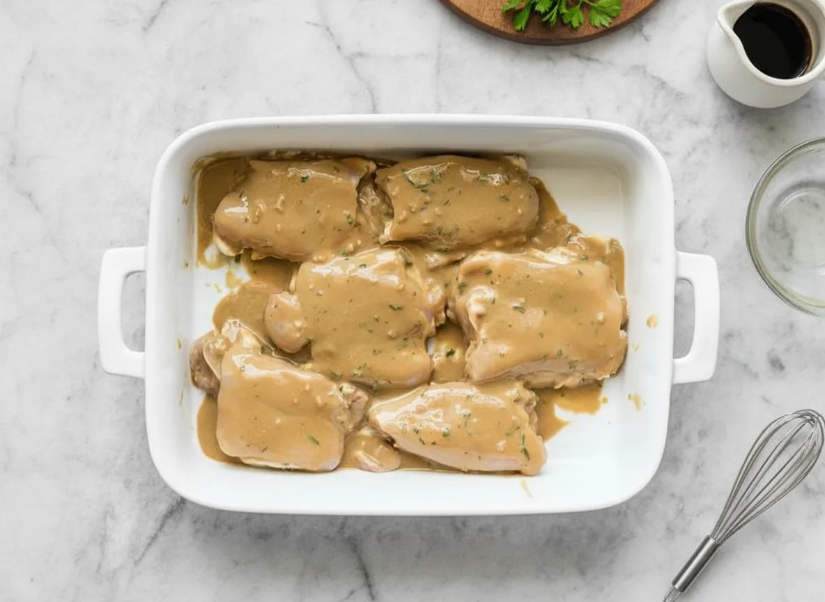 Place chicken thighs in a baking dish or cast iron skillet, making sure they sit close together without overlapping. This positioning helps the chicken stay moist while cooking. Pour the marinade over the chicken, using a spoon or brush to coat each piece thoroughly on all sides.