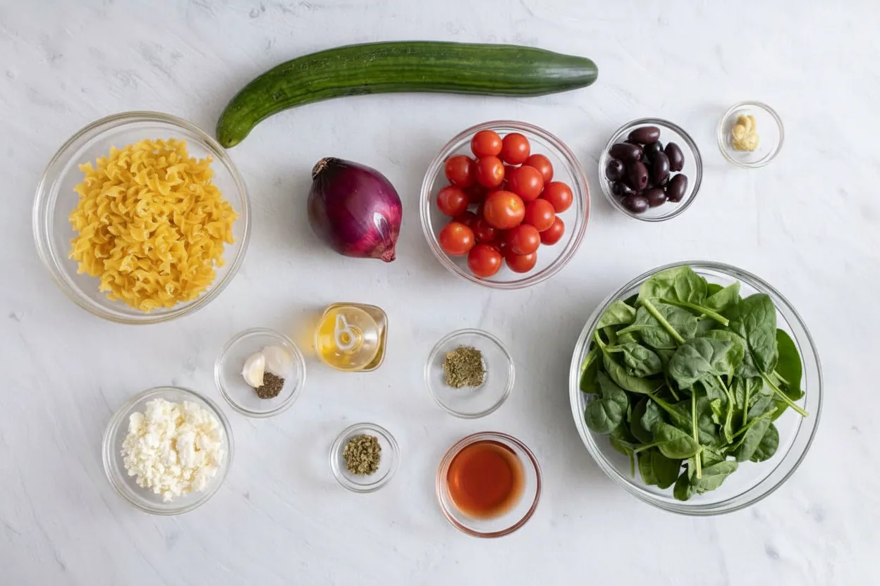 It combines al dente fusilli pasta with crisp cucumber, sweet tomatoes, briny olives, and creamy feta cheese. Additionally, everything gets tossed in a zesty, herb-infused dressing. As a result, you get a vibrant, colorful salad that bursts with flavor in every bite.