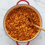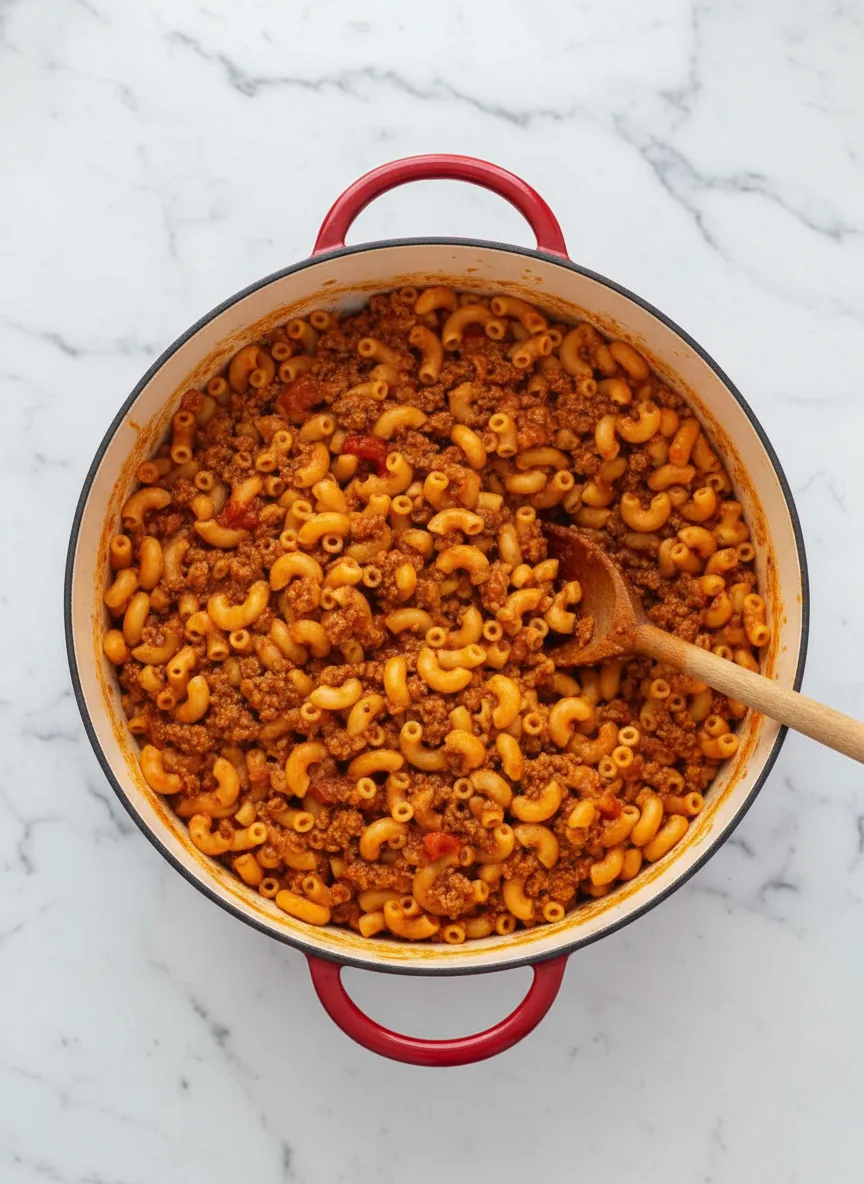 A nostalgic one-pot meal featuring savory ground beef, aromatic spices, and tender pasta in rich tomato sauce.