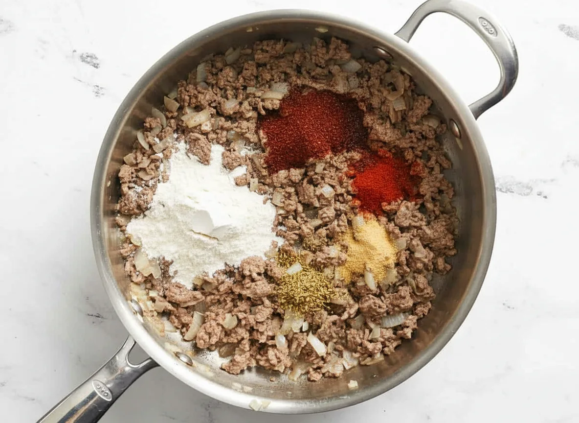 Add textured vegetable protein to the skillet. Stir while cooking four minutes until well-browned. Sprinkle flour, chili powder, smoked paprika, garlic powder, and oregano over everything. Cook another two minutes, letting spices toast gently.