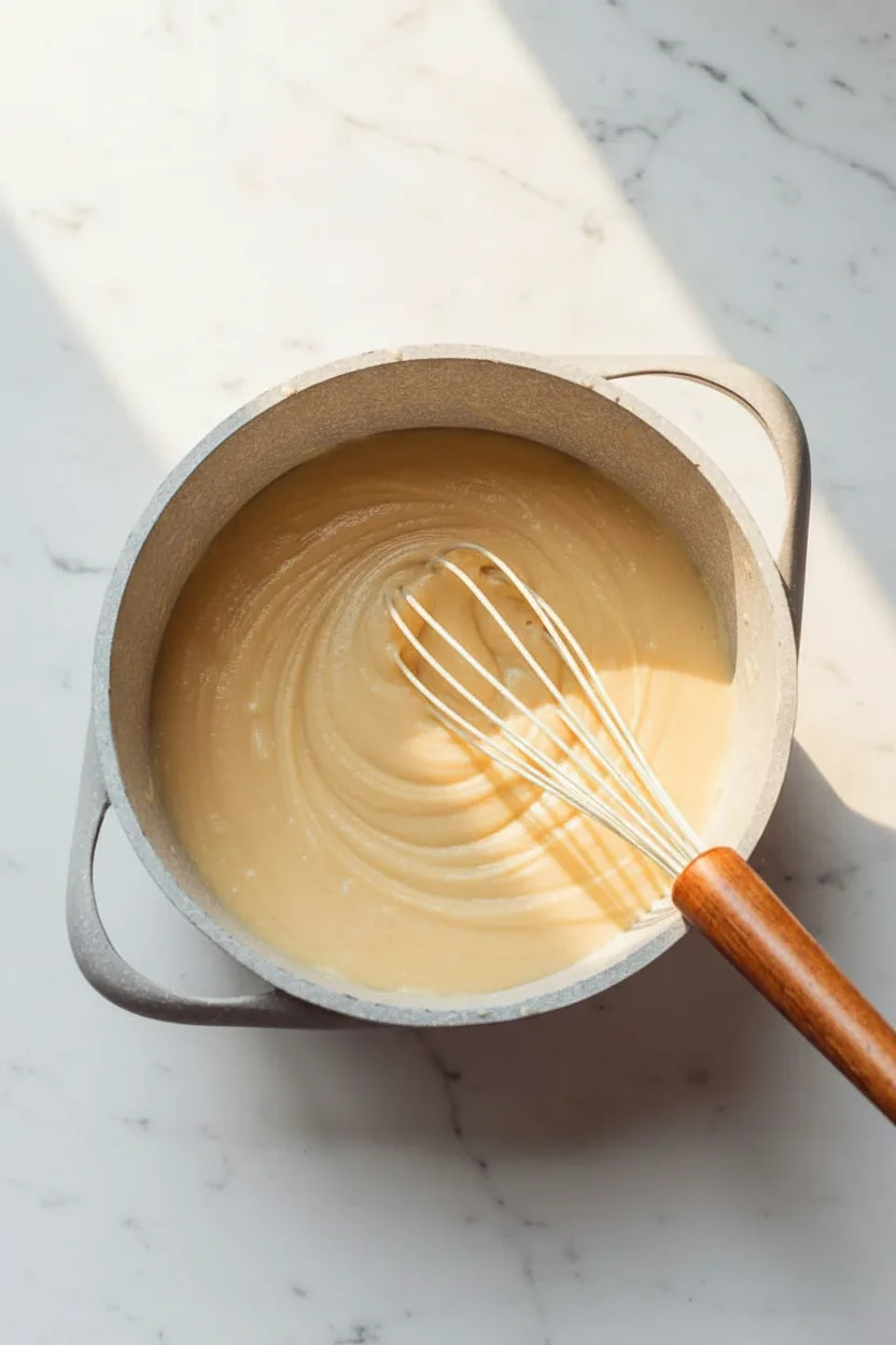 - Stir flour mixture into melted butter to form a thick paste when milk reaches temperature.