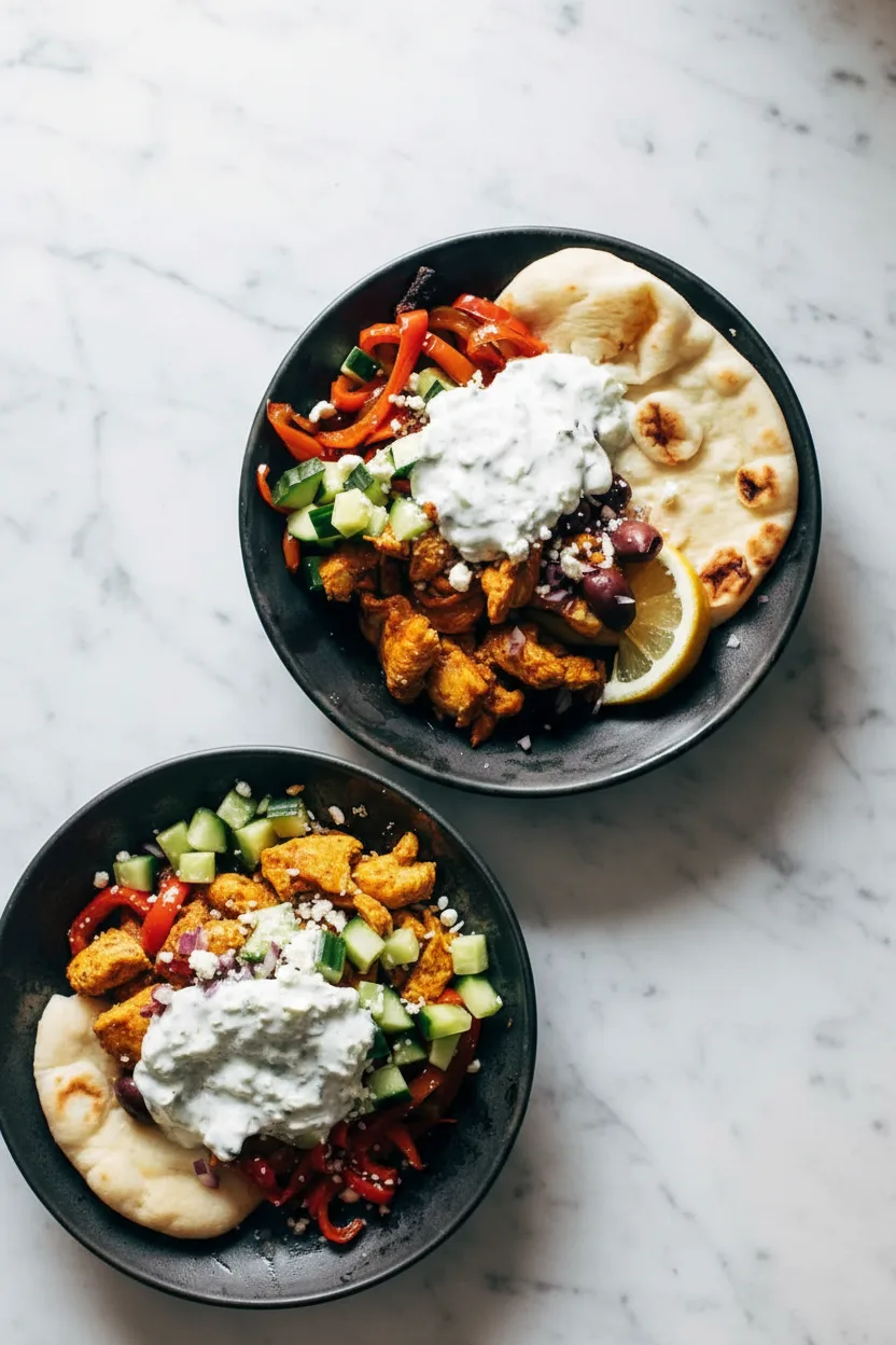 Warm flatbreads briefly in the oven or microwave. Set out a platter with roasted chicken, peppers, diced cucumber, red onion, olives, and feta. Provide bowls of tzatziki and let everyone build their pitas. Encourage layering sauce first to prevent soggy bread! Alternatively, serve components as a salad bowl with pita wedges on the side.