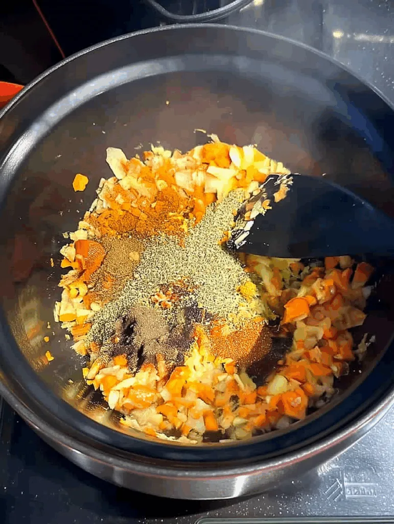 The first step is to wake up your aromatics. A quick sauté of onion, carrot, and celery unlocks their natural sweetness. This step may seem small, but it sets the foundation for big flavor later. Once you mix in the spices, the slow cooker steps in to work its patient magic. Vegetable stock brings depth and keeps everything balanced.