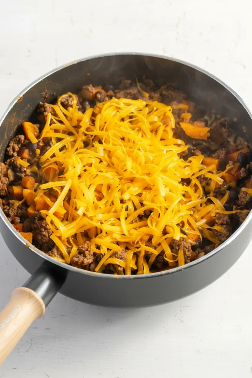 Remove the lid after the sweet potatoes become tender. If using cheese, sprinkle it evenly over the hot mixture. Cover again for 5 minutes, allowing residual heat to melt the cheese without using additional energy sources. For cheese-free versions, simply let the dish rest uncovered to settle flavors before serving.