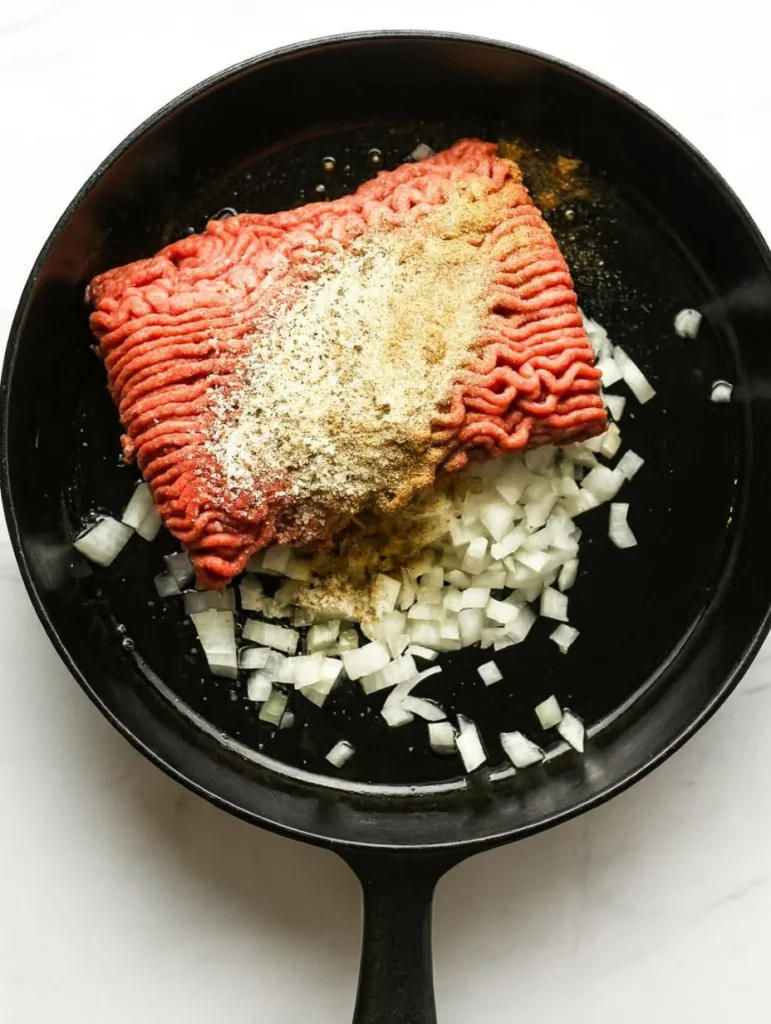 - Heat olive oil in a cast iron skillet over medium-high heat. Add onion and ground beef, seasoning with cumin, onion powder, salt, and pepper. Cook until beef is browned and crumbly.