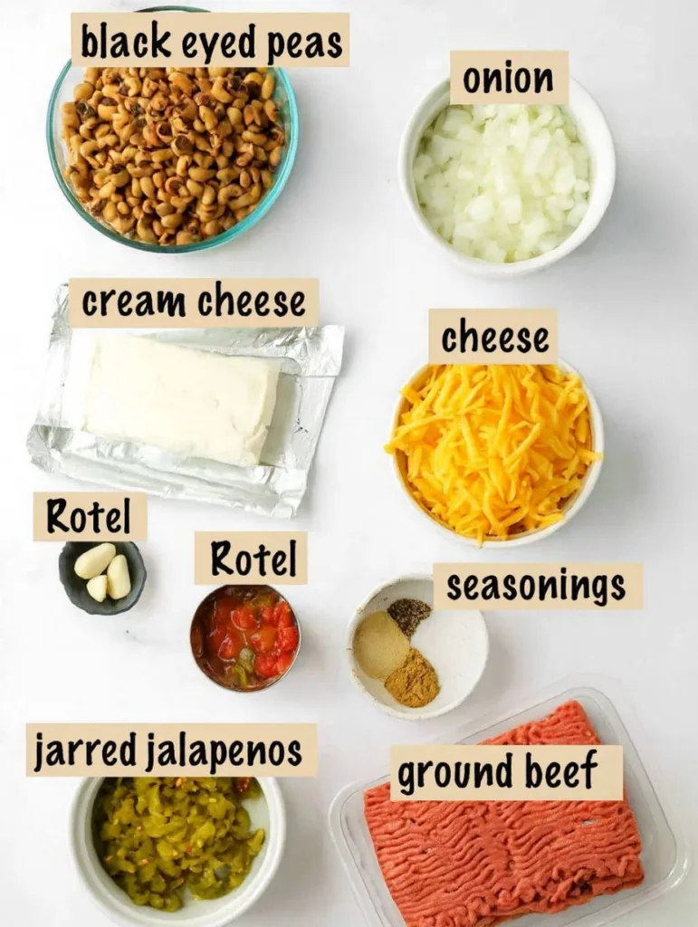 A creamy, spicy, and savory dip made with black-eyed peas, ground beef, jalapeños, and cheese, baked until bubbly perfection.