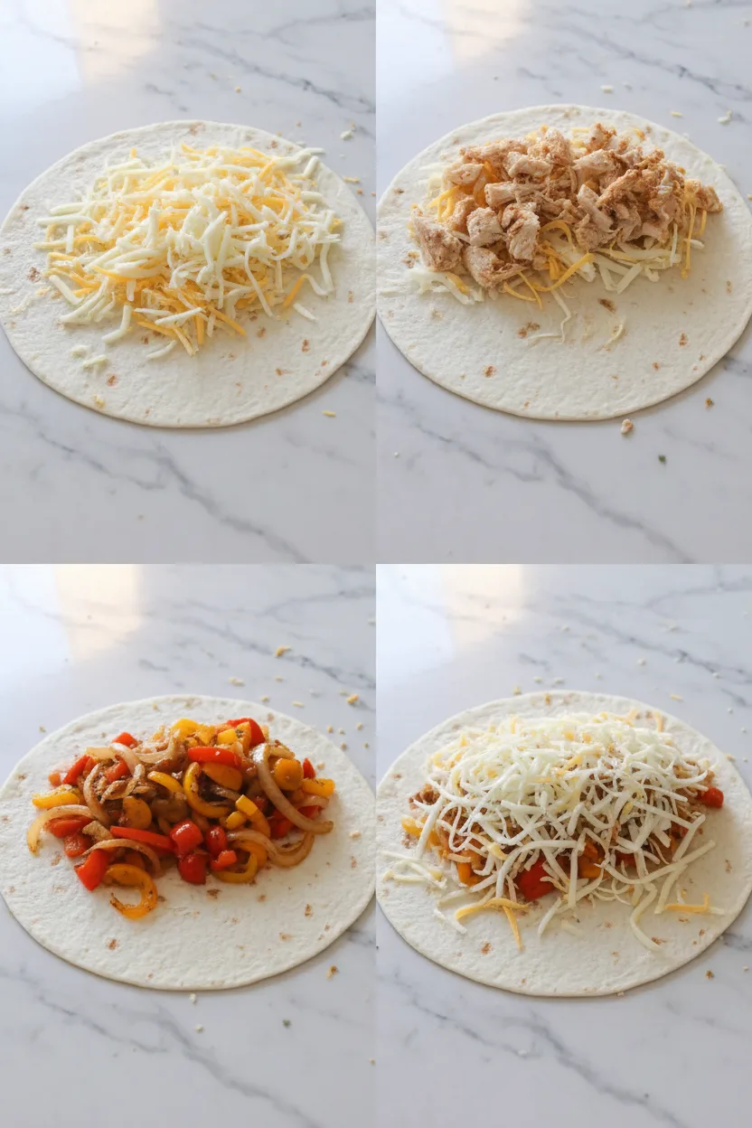 Lay tortillas flat and spread cheese on half of each one. Layer with chicken, veggies, more cheese, then fold. Press gently to help ingredients adhere before cooking.