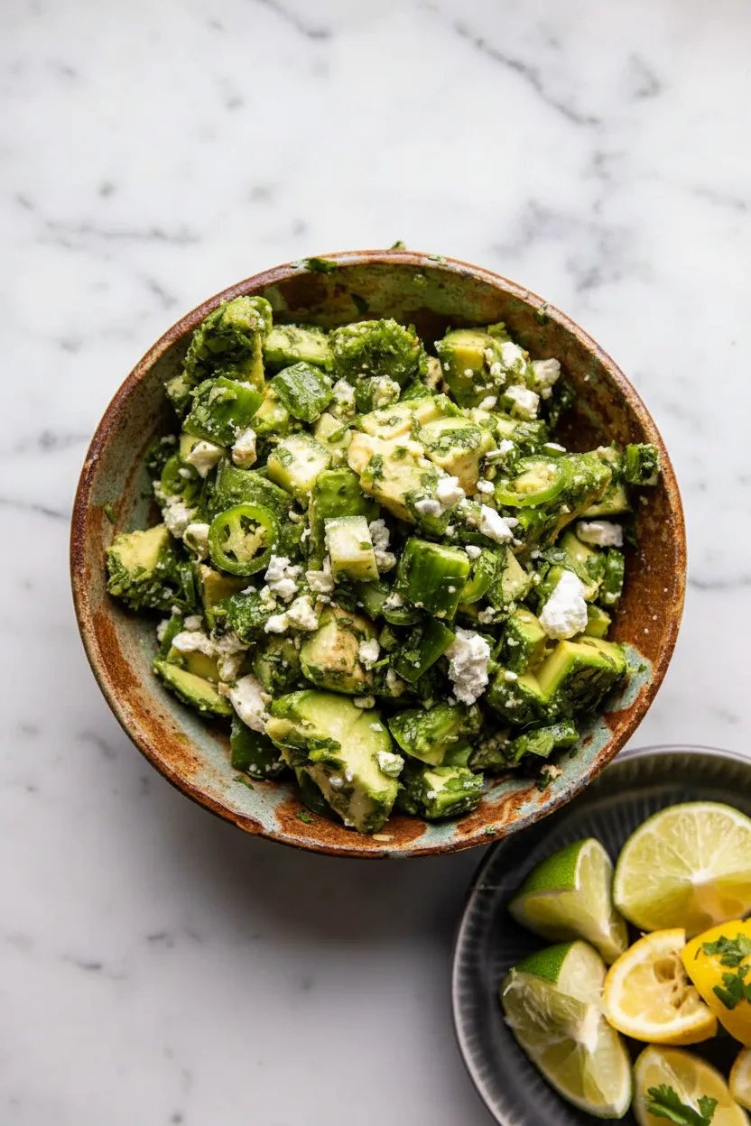 Now, focus on the fresh salad component. Dice your avocados and chop the cucumbers. Slice the serrano pepper thinly. Combine the avocado, cucumber, serrano, remaining cilantro, and ground cumin in a mixing bowl. Crumble the feta cheese over the top. Then, drizzle with olive oil, lemon juice, and lime juice. Gently toss everything together. Season the salad with salt to your liking. For more crunchy salad inspiration, check out this refreshing cucumber caprese salad.
