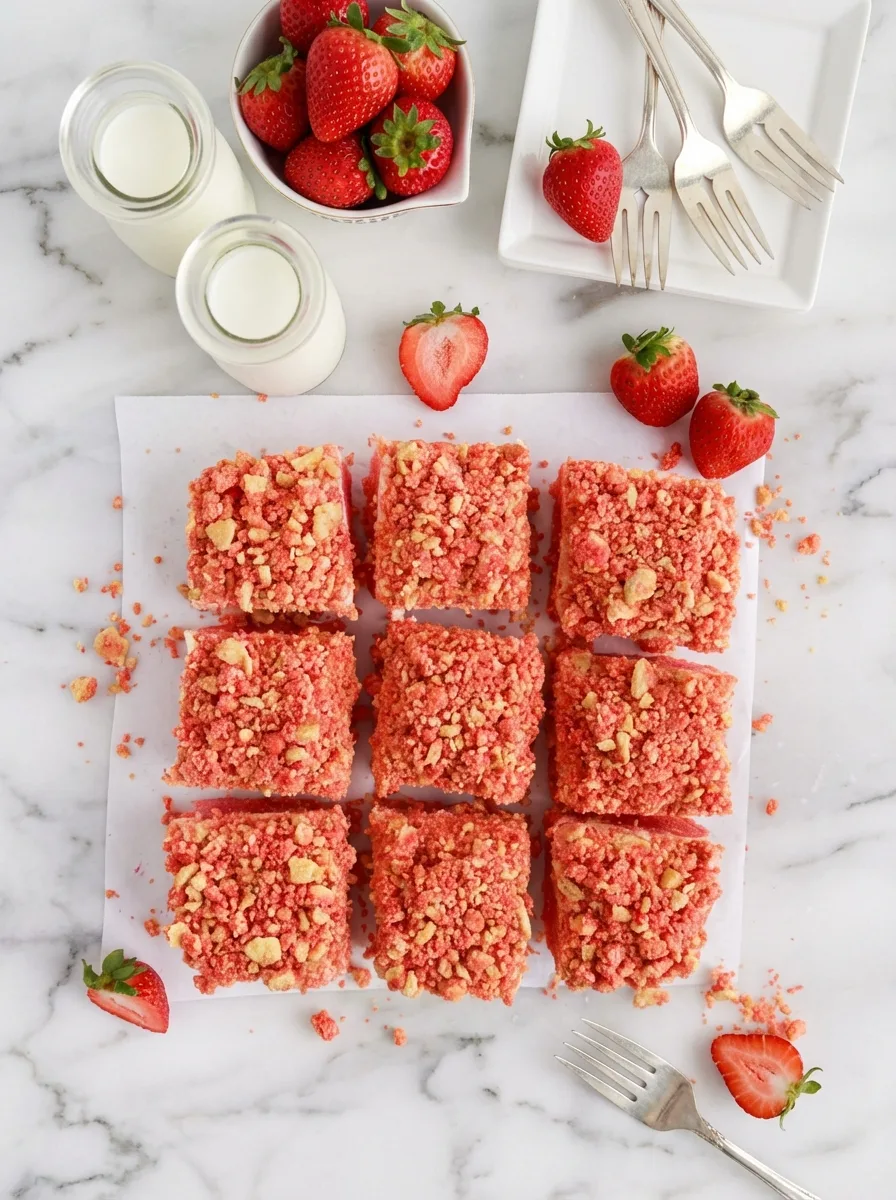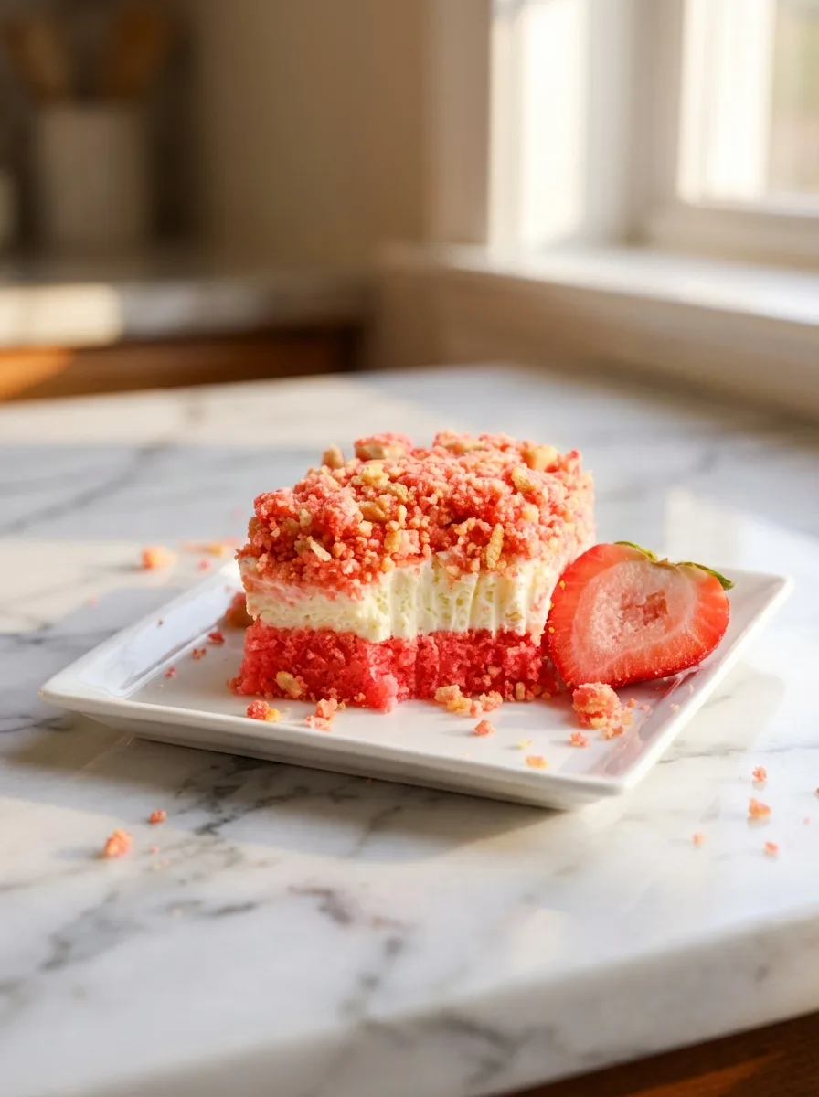 Perfect for potlucks, picnics, or family dessert nights, this treat brings smiles to every occasion. With a fudgy base layer, creamy topping, and crunchy strawberry crumbles, it’s an irresistible dessert experience.