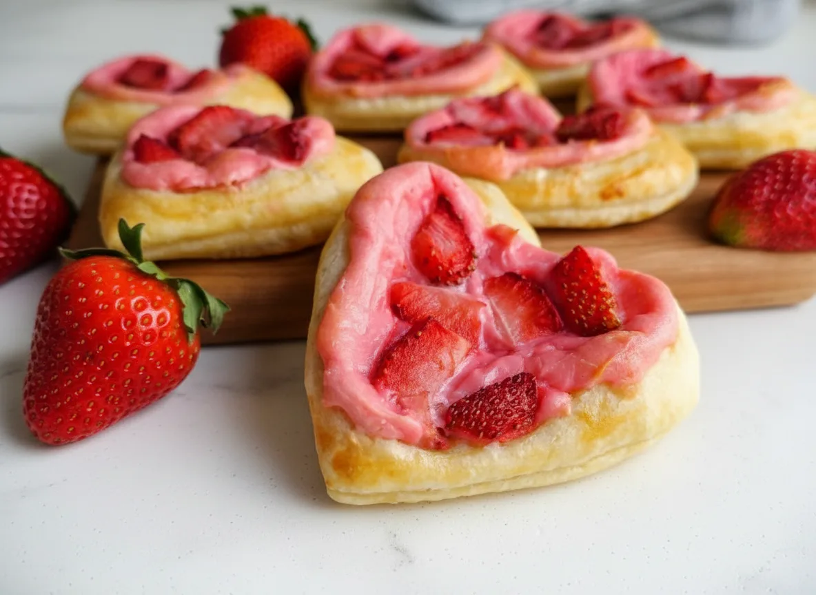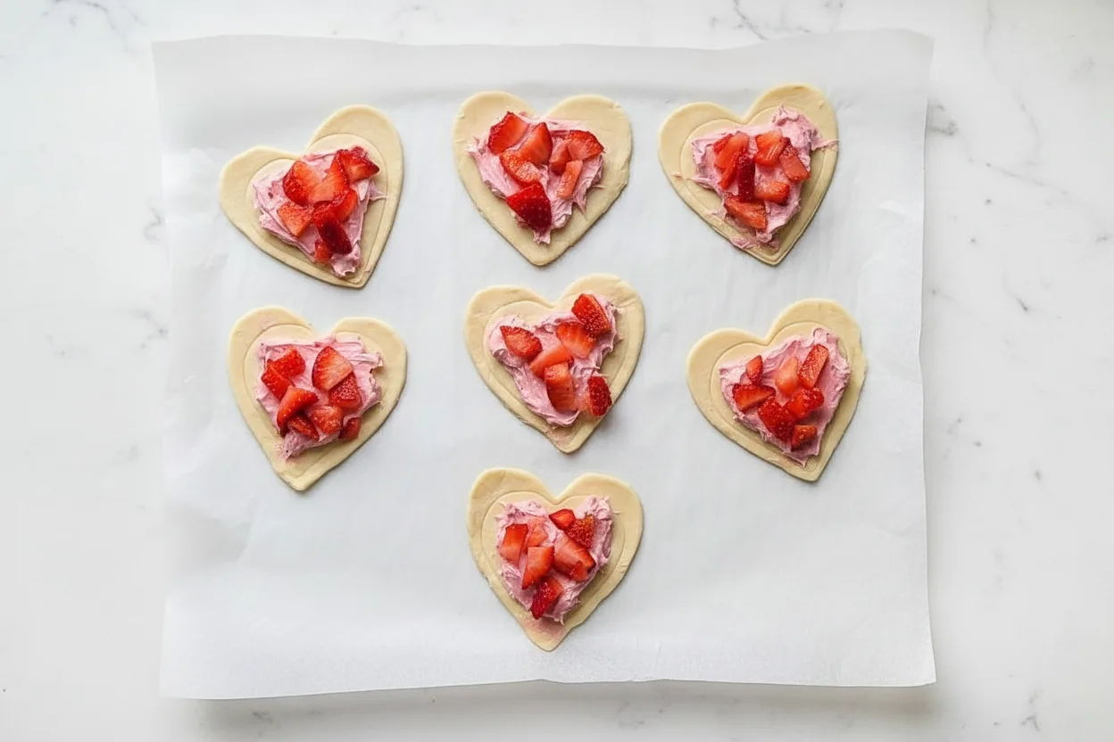 Flaky puff pastry hearts filled with sweet cream cheese and juicy strawberries
